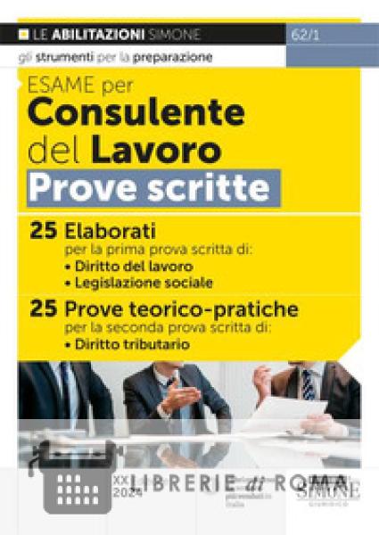 Questo testo "Esame per Consulente del Lavoro. Prove scritte", finalizzato alla preparazione all'esame di abilitazione, contiene 25 elaborati svolti di Diritto del Lavoro e Legislazione sociale e 25 prove teorico-pratiche svolte di Diritto Tributario per la prova scritta dell'esame Consulente del lavoro. Gli elaborati e le prove teorico-pratiche, che tengono conto degli argomenti più ricorrenti nelle precedenti sessioni di esame, sono aggiornati alle più recenti novità legislative e, in particolare, alla legge di bilancio 2024 (L. 213/2023) (es. trattamento economico del congedo parentale dei lavoratori subordinati); al Decreto PNRR (D.L. 19/2024, conv. in L. 56/2024) (es. modifica del regime sanzionatorio dell'appalto illecito) e al Decreto Superbonus (D.L. 39/2024, conv. in L. 67/2024) (deroga al divieto di cessione del credito/sconto in fattura per interventi legati al Superbonus e ai Buoni ordinari). Ciascun elaborato è preceduto da riferimenti normativi e da uno schema di svolgimento, che forniscono un valido ausilio per esercitarsi in vista delle prove. Questa edizione contiene, in Appendice, anche le tracce di diritto del lavoro, legislazione sociale e diritto tributario assegnate agli Esami di Stato dal 2010 al 2019. Per una preparazione completa all'Esame consulente del lavoro, si consiglia anche il manuale dedicato e aggiornato. Puoi anche visitare la pagina dedicata all'esame consulente del lavoro, con tutti i testi di approfondimento per le prove scritte e per la prova orale.