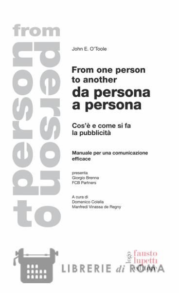 Questa pubblicazione fa parte di una serie di classici senza tempo indispensabili per capire l'evoluzione del linguaggio pubblicitario. John O'Toole si rifà, tra gli altri, agli scritti di John Hopkins, uno dei primi copywriter strategici della storia insieme a John E. Kennedy. Hopkins lavorava alla Lord & Thomas, che fu diretta per anni dal leggendario Albert Lasker (da un dialogo di quest'ultimo con John E. Kennedy nasce la definizione di pubblicità come "salesmanship in print" ripresa anche da O'Toole nel libro). E proprio la Lord & Thomas, ceduta da Lasker ai suoi tre top manager Foote, Cone e Belding, diventa la FCB: agenzia dove il nostro John O'Toole lavorerà per tre decadi, entrando come copywriter sotto Fairfax Cone, cui il libro è affettuosamente dedicato, e concludendo la carriera da presidente e chairman, dopo essere stato per anni direttore creativo "and various other things", come amava dire. Con From One Persone To Another, pubblicato in origine solo per i collaboratori della FCB, O'Toole sviluppa diversi concetti dei grandi pubblicitari della sua epoca, ma ne approfondisce e fa suo soprattutto uno: la comunicazione da persona a persona. Si vende sempre a una persona La tesi di John O'Toole è semplice: non si vende a una folla indistinta, bensì sempre a una persona. Pensiero ripreso da David Ogilvy con la famosa frase: "II consumatore non è stupido. Il consumatore è tua moglie". O'Toole va però oltre, mettendo a punto un vero e proprio sistema per ottenere una comunicazione pubblicitaria che funziona. L'imperativo per tutti i collaboratori della FCB era "Know The Consumer Better": per conoscere meglio il consumatore, ogni buon pubblicitario doveva uscire dalla sua cerchia di colleghi e frequentare la gente comune. Anche le idee andavano testate in strada, sui mezzi pubblici, al bar, non chiusi in agenzia. I dodici capitoli del libro approfondiscono quelli che, secondo O'Toole, sono i punti cruciali di una comunicazione efficace (strategia, idea, esecuzione) insieme ad altri temi portanti come il valore delle ricerche di mercato e lo studio del potenziale cliente. Partendo dalle basi tracciate dai suoi predecessori, O'Toole vuole dunque arrivare a una visione matura e sistemica della comunicazione. La lettura di questo manuale è utile a tutti coloro che si interessano di advertising. Ora, forse, più che mai. Il web infatti rende semplici e immediate operazioni che una volta erano lente e costosissime, come ad esempio i test e le ricerche. Le strategie alla base della comunicazione e i bisogni delle persone di oggi sono però ancora gli stessi che tratta O'Toole. Qui sta la modernità del libro da persona a persona, finalmente disponibile in traduzione italiana. Presentazione di Giorgio Brenna, FCB Partners.