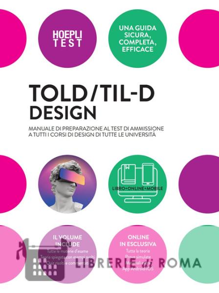 Un manuale di preparazione in volume unico basato sui programmi previsti dal TOLD del Politecnico di Milano e dal TIL-D del Politecnico di Torino, valido per affrontare il test d'ammissione ai corsi di Design di tutte le università; il tutto in modo completo, sicuro ed efficace. L'offerta: Libro + Online + Mobile include: un libro cartaceo con tutte le materie d'esame, vale a dire Matematica (Geometria), Logica, Comprensione verbale, Storia del design, Storia dell'arte, Cultura generale; le spiegazioni teoriche sempre accompagnate da esempi svolti; oltre 3000 quiz con soluzione e spiegazione delle risposte; l'accesso riservato a tutta la teoria interrogabile online e agli esercizi collegati; alla simulazione della prova d'esame; a capitoli extra bonus di Comprensione verbale e Cultura generale; la possibilità di scaricare gratuitamente un'app per Android e IOS con cui allenarsi senza fine.