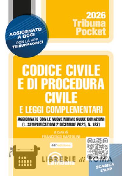 Quest'opera fornisce ai lettori il testo aggiornato del Codice civile, del Codice di procedura civile e delle principali leggi complementari. La selezione delle leggi complementari comprende materie fra le quali segnaliamo: Fallimento e crisi di impresa; Intelligenza Artificiale; Lavoro; Locazioni; Matrimonio; Mediazione; Negoziazione assistita; Semplificazione dei riti civili. Aggiornato con la L. 2 dicembre 2025, n. 182 (Legge semplificazioni) recante modifiche al Codice civile in materia di donazioni, assenza, morte presunta.