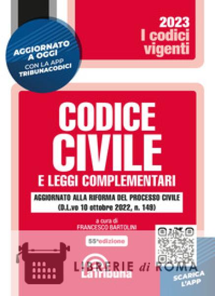 Quest'Opera fornisce ai lettori il testo aggiornato del Codice civile e delle principali leggi complementari. La selezione delle leggi complementari comprende materie fra le quali segnaliamo: Adozione; Assicurazioni; Banche; Edilizia e urbanistica; Fallimento e crisi di impresa; Lavoro; Locazioni; Matrimonio; Mediazione; Società e borsa; Sovraindebitamento; Tutela dei consumatori e class action. Questa edizione è aggiornata al decreto legislativo, di attuazione della legge delega di riforma del processo civile (D.L.vo 10 ottobre 2022, n. 149). In particolare, il decreto reca modifiche alla normativa del codice civile in materia di diritto delle persone e della famiglia. La Tribuna offre la possibilità di ricevere ogni giorno tutti gli aggiornamenti normativi che riguardano questo Codice. Infatti, è attiva un'apposita App che permette di essere costantemente aggiornati.