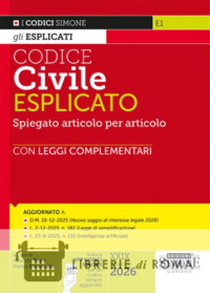 I Codici Esplicati nascono per offrire uno strumento chiaro e immediato a chiunque studi o applichi il diritto, facilitando la lettura della norma e la comprensione dei suoi aspetti essenziali. Ogni articolo del Codice è arricchito da elementi pensati per rendere lo studio più efficace e la consultazione più rapida: - definizioni delle parole chiave in neretto, utili come glossario dei termini tecnici; - note di commento, dedicate ai singoli commi; - esposizione della ratio della norma, evidenziata su fondino grigio; - collegamenti essenziali e rinvii ad altre definizioni, articoli e leggi speciali; - riferimenti giurisprudenziali che mostrano l'applicazione concreta delle disposizioni; - leggi complementari in Appendice, a integrazione della disciplina codicistica; - indice analitico-alfabetico, per una ricerca immediata dei contenuti. La XXIX edizione del Codice Civile Esplicato è aggiornata al D.M. 10-12-2025 (Nuovo saggio di interesse legale 2026), alla L. 2-12-2025, n. 182 (Legge di semplificazione) con le nuove norme sull'assenza, morte presunta e circolazione dei beni di provenienza donativa, alla L. 23-9-2025, n. 132 (Intelligenza artificiale). L'App CodiciSimone, disponibile gratuitamente sia per iOS e Android, permette di consultare il codice dallo smartphone e averlo sempre aggiornato in tempo reale.