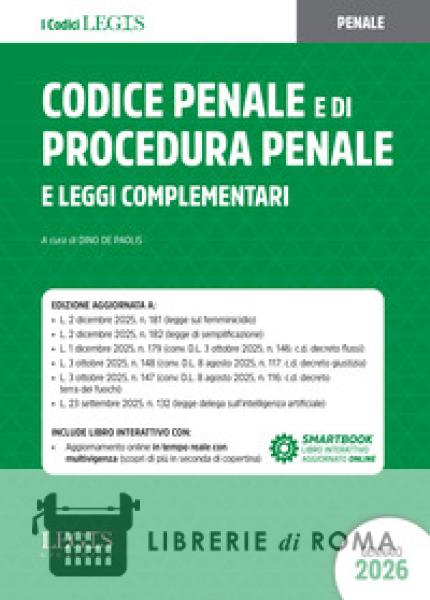 L'opera rappresenta un insostituibile e solido sussidio per magistrati, avvocati, studenti e studiosi. È suddivisa in quattro parti: disciplina normativa fondamentale nazionale e sovranazionale, Codice penale, Codice di procedura penale e leggi penali complementari. Gli articoli del libro secondo e terzo del Codice sono corredati da note procedurali e note in multivigenza. Chiudono il volume l'indice cronologico, l'indice analitico del Codice penale e del Codice di procedura penale. Il testo è aggiornato alle più recenti novità normative: la L. 02/12/2025, n. 181 (legge sul femminicidio), la L. 02/12/2025, n. 182 (legge di semplificazione), la L. 01/12/2025, n. 179 (conv. D.L. 03/10/2025, n. 146: c.d. decreto flussi), la L. 03/10/2025, n. 148 (conv. D.L. 08/08/2025, n. 117: c.d. decreto giustizia), la L. 03/10/2025, n. 147 (conv. D.L. 08/08/2025, n. 116: c.d. decreto terra dei fuochi), la L. 23/09/2025, n. 132 (legge delega sull'intelligenza artificiale), la L. 09/06/2025, n. 80 (conv. D.L. 11/04/2025, n. 48: c.d. decreto sicurezza), la L. 06/06/2025, n. 82 (delitti contro gli animali). L'edizione include il libro interattivo, aggiornato online in tempo reale con multivigenza.