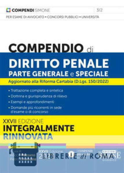La nuova produzione della collana Compendi Simone del 2023, di cui fa parte il Compendio di Diritto Penale parte Generale e Speciale, è attraversata da una fase di profondo cambiamento nella grafica, nella struttura e nel modo in cui sono trattati gli argomenti. Più di 50 anni fa le Edizioni Simone inventavano i compendi di diritto per l'università. Oggi il metodo tradizionale Simone, teso a unire un'esposizione chiara al rigore scientifico, è stato rivisto alla luce delle rinnovate esigenze dei diversi lettori interessati a questa tipologia di prodotto. Il linguaggio utilizzato è stato così reso più semplice e immediato e gli istituti fondamentali della disciplina sono stati esaminati a partire dalla loro definizione, al fine di individuare subito il primo dato indispensabile per favorire uno studio sistematico. Anche l'aggiornamento legislativo e giurisprudenziale, che caratterizza da sempre i Compendi, è stato rivisto nell'ottica di fornire un immediato risalto. Gli stessi orientamenti della dottrina sono stati rielaborati alla luce della manualistica più diffusa. Nell'esposizione degli argomenti, in alcuni casi, sono stati utilizzati tre elementi didattici, messi in evidenza con diversi corpi di stampa e con apposite icone. In tal modo sono evidenziati gli approfondimenti, per chi intende esaminare e comprendere maggiormente un tema, gli esempi, che consentono di chiarire un concetto, e le differenze, per definire i tratti caratteristici di un istituto in rapporto con altri simili. In chiusura di ogni capitolo del Compendio, infine, sono riportate le schede di sintesi e le domande più ricorrenti in sede di esame o di concorso, in modo da permettere al lettore di verificare immediatamente il livello di preparazione raggiunto. Per tali caratteristiche, il Compendio di Diritto Penale parte Generale e Speciale 2023 si conferma ancora una volta lo strumento di studio indispensabile per chi intende sostenere l'esame di avvocato, un concorso pubblico o preparare un esame universitario.
