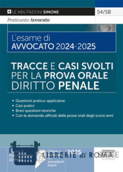 Il manuale L'esame di Avvocato 2024-2025. Tracce e casi svolti per la prova orale - Diritto penale è diretto alla preparazione della prova orale dell'esame da Avvocato. Anche per la sessione 2024-2025, la prova orale dell'esame di Avvocato verterà sulla risoluzione di una questione pratico-applicativa, cui seguiranno, come di consueto, brevi domande sulle materie scelte dal candidato (diritto civile, diritto penale, diritto amministrativo, diritto processuale civile e diritto processuale penale), nonché sull'ordinamento e la deontologia forense. Il manuale per L'esame di Avvocato 2024 - 2025 Tracce e casi svolti per la prova orale - Diritto penale è diretto alla preparazione della prova orale dell'esame da Avvocato. Anche per la sessione 2024-2025, la prova orale dell'esame di Avvocato verterà sulla risoluzione di una questione pratico-applicativa, cui seguiranno, come di consueto, brevi domande sulle materie scelte dal candidato (diritto civile, diritto penale, diritto amministrativo, diritto processuale civile e diritto processuale penale), nonché sull'ordinamento e la deontologia forense. Il presente manuale, al fine di consentire una adeguata preparazione, contiene casi svolti e commentati. Nello svolgimento di ciascuno sono messi in risalto gli istituti sostanziali e processuali, nonché la giurisprudenza più rilevante e recente della Corte di Cassazione indispensabile per l'analisi e la risoluzione del caso. I casi trattati sono stati, inoltre, selezionati tenendo conto di quelli proposti nelle precedenti sessioni d'esame. Chiudono il libro brevi questioni di diritto penale, utili al candidato per assimilare un metodo espositivo efficace per il superamento della prova orale. Tra le espansioni online sono disponibili le domande proposte dalle varie commissioni nelle sessioni d'esame degli anni precedenti.