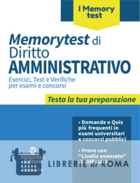 Chi studia per gli esami universitari o per i concorsi pubblici ha un bisogno "vitale" di saggiare l'andamento dello studio e di verificare se sta dando i risultati auspicati. Questi strumenti di verifica mancano ed è invece "molto opportuno" avere tempestiva contezza di come la preparazione procede. Con la Collana Memorytest è possibile allora affiancare alla preparazione teorica una corrispondente verifica. In questa prospettiva, i volumi Memorytest sono diretti a stimolare il candidato nel fissare e memorizzare nozioni e concetti chiave, nonché nel collegare, cogliere e comprendere istituti e discipline. Come sono organizzati i Memorytest? Assai innovativa è la struttura dei Memorytest articolati nelle seguenti sei Sezioni: 1. Vero o falso; Quiz a scelta multipla; 3. Domande di esame; 4. Cerca l'errore; 5. Correlazioni (utilissime per saggiare la capacità di collegare le nozioni acquisite); 6. Caso da risolvere (utile per impossessarsi di istituti e discipline, facendone concreta applicazione). Nel costruire gli esercizi si è tenuto anche conto delle domande formulate nei più diffusi concorsi pubblici, nonché dei quiz più frequentemente somministrati nei concorsi con prova preselettiva. Come i Memorytest accompagnano una preparazione graduale e progressiva? Nel percorso di preparazione l'acquisizione compiuta delle conoscenze ha luogo in modo graduale. A tal fine, nei Memorytest, per ciascuna delle prime quattro indicate Sezioni ("Vero o falso", "Quiz a scelta multipla", "Domande di esame", "Cerca l'errore"), dopo gli esercizi di livello base, ne sono somministrati taluni con un livello più intenso di difficoltà, indicati con l'acronimo "LA" (id est, Livello avanzato). Sono, inoltre, indicati i capitoli e paragrafi dei corrispondenti volumi "Dispense d'Autore" e "Compendi d'Autore", nei quali le questioni sono trattate.