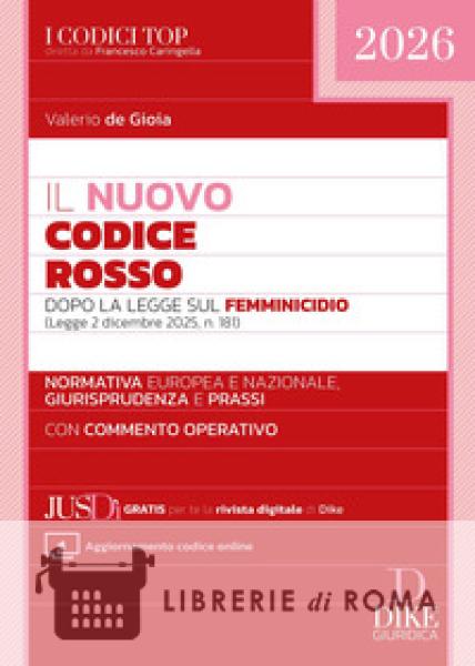 Il nuovo Codice Rosso spiega le norme di maggiore rilievo, in particolare quelle introdotte dalla legge sul femminicidio (L. 2 dicembre 2025, n. 181) con un commento autoriale che ne chiarisce l'applicazione e l'impatto operativo, accompagnato dalle principali massime giurisprudenziali che ne hanno definito l'interpretazione nei casi concreti. Il Codice, curato da Valerio de Gioia, massimo esperto in materia, magistrato penale e Consulente della Commissione parlamentare di inchiesta sul femminicidio nonché su ogni forma di violenza di genere, raccoglie in modo sistematico e completo l'articolata e complessa disciplina nazionale, europea e internazionale relativa alla tutela delle vittime di violenza di genere e domestica. Questo nuovo Codice Rosso dopo la legge sul femminicidio, inoltre: contiene la Carta costituzionale, tutte le norme di interesse dei codici civile, penale e di procedura, le principali leggi speciali, le convenzioni internazionali, le direttive europee, le circolari INPS e i provvedimenti del Consiglio Superiore della Magistratura. è ideale per magistrati, avvocati, studiosi e operatori dei servizi sociali e dei centri antiviolenza, costituisce uno strumento pratico e aggiornato per orientare l'intervento giuridico e sociale, facilitare la consultazione normativa e promuovere una cultura istituzionale fondata sulla prevenzione, la protezione e il rispetto dei diritti delle donne permette di consultare online le novità normative, che dovessero sopravvenire, e accedere gratuitamente alla rivista digitale Jusdì.