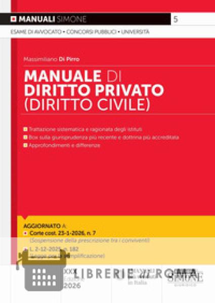 Il Manuale di Diritto Privato è uno strumento indirizzato a coloro che devono superare un esame universitario, un concorso pubblico o l'abilitazione alla professione forense, poiché consente una preparazione rapida e completa grazie alla sinteticità dell'analisi e all'accuratezza della trattazione. Le questioni giuridiche sono esaminate con un'esposizione chiara e scorrevole, richiamando i principali orientamenti dottrinali e giurisprudenziali riassunti in appositi box con fondino. Le parti più rilevanti del testo sono evidenziate con grassetti e corsivi. Anche questa XXX edizione presenta l'originale struttura e impianto grafico che caratterizzano i Manuali Simone per consentire l'agevole lettura e comprensione del testo, senza tralasciare gli approfondimenti delle tematiche più complesse e attuali. Tra le novità di questa edizione sono da segnalare gli aggiornamenti alla L. 182/2025 che ha introdotto una nuova disciplina in materia di assenza, morte presunta e azione di restituzione, con particolare riferimento alla circolazione dei beni di provenienza donativa. Viene data ampia rilevanza alle pronunce più recenti della giurisprudenza e, fra queste, le pronunce della Corte costituzionale (sent. 7/2026 sulla sospensione della prescrizione tra i conviventi) e della Cassazione (sent. 20415/2025 sulla validità dei patti pre-matrimoniali; Cass. S.U. 23093/2025 sulla rinuncia alla proprietà immobiliare). Particolare attenzione è dedicata all'esposizione di tematiche attuali e in continua evoluzione come quelle relative al rifiuto di trattamenti sanitari, all'identità sessuale, all'adozione dei single, allo status dei figli di coppie omogenitoriali, alla maternità surrogata, ai danni da illecito civile.