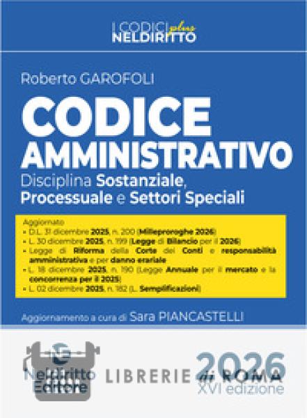 L'Edizione gennaio 2026 del Codice Amministrativo, NelDiritto Editore, tiene conto di tutte le più recenti novità normative, tra le tante si segnalano: Legge di Bilancio per il 2026; Legge di Riforma della Corte dei Conti; Decreto Milleproroghe (dicembre 2025); L. 02 dicembre2025, n. 182 - c.d. Legge Semplificazioni; L. 01 dicembre 2025, n. 179, di conv. del D.l. 3 ottobre 2025, n. 146 - c.d. Decreto Flussi; D.lgs. 27 novembre2025, n. 184 -Codice degli incentivi. Ad arricchire il Volume un'estensione online contenente gli Allegati, aggiornati, al Codice dei contratti pubblici non inseriti nel volume e le Direttive 2014/23/UE, 2014/24/UE e2014/25/UE del Parlamento europeo e del Consiglio, del 26 febbraio 2014, alle quali Codice e Allegati di frequente rinviano. Completa il Volume un corposo Indice analitico.