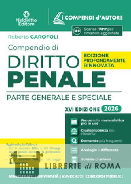 Compendio di Diritto penale per l'esame di avvocato, i concorsi e l'università La collana I Compendi d'Autore da circa 20 anni è punto di assoluto riferimento per chi prepara gli esami universitari o le prove di abilitazione forense e dei principali concorsi pubblici. A caratterizzare la Collana sono la chiarezza nella forma, la sinteticità abbinata a completezza nella sostanza. Nell'Edizione 2026 veste grafica, struttura e contenuti sono profondamente rivisti per rispondere ancor più efficacemente alle esigenze di chi si prepara. Sul piano grafico, box, grassetti, elenchi puntati, rendono lo studio e la memorizzazione assai più agevoli. Numerosi i nuovi contenuti. L'intera trattazione è attentamente ricalibrata tenendo conto delle domande più frequenti negli esami universitari e nelle prove dei principali concorsi pubblici. È riportata e citata in appositi Focus dottrinali la Manualistica più utilizzata nelle Università, così da assicurare una preparazione completa. Si dà inoltre atto in Box giurisprudenziali degli orientamenti interpretativi più rilevanti; Per i principali istituti, sono messe a fuoco in ulteriori Tabelle, le Analogie e le Differenze per una conoscenza sistematica della materia. Per agevolare il ripasso sono, infine, inseriti in chiusura dei capitoli due ulteriori strumenti: le Schede di sintesi, utilissime per consolidare le conoscenze acquisite; le Domande più frequenti, per saggiare la preparazione. Il Compendio di Diritto penale tiene conto delle più recenti novità normative, tra le tante, si segnalano: D.l. 31 dicembre 2025, n. 200 (Proroga scudo penale esercenti la professione sanitaria); L. 02 dicembre 2025, n. 181 (Legge Femminicidio); L. 3 ottobre 2025, n. 147, di conv. del D.l. 8 agosto 2025, n. 116 (Reati ambientali); L. 23 settembre 2025, n. 132 (Intelligenza artificiale). Numerosissimi gli aspetti tratti dall'esame dal più significativo dibattito giurisprudenziale.