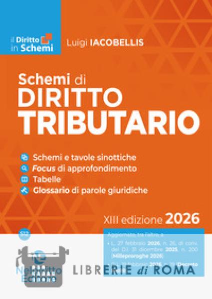 Tutto il Diritto tributario in Schemi e tabelle, per una preparazione efficace e rapida. La Collana" Il Diritto in Schemi" intende fornire un supporto per l'apprendimento e il ripasso delle principali discipline oggetto diesami e concorsi. Gli "Schemi" guidano lo studente e il concorsista nello studio delle materie, aiutandolo a focalizzare l'attenzione sulle nozioni fondamentali e sugli aspetti principali di disciplina di ogni argomento, sulle analogie e le differenze tra gli istituti, sui profili meritevoli di approfondimento perché oggetto di attenzione da parte della dottrina e della giurisprudenza. I volumi sono caratterizzati dalla schematizzazione degli argomenti, che rende possibile una chiara e immediata comprensione e un'agevole memorizzazione, ed in particolare contengono: schemi e tavole sinottiche; tabelle di comparazione tra istituti; focus riquadri di approfondimento; particolari accorgimenti grafici, quali l'uso di simboli, elenchi puntati e grassetti, per sviluppare la memoria visiva. Tali elementi rendono i volumi una guida pratica per chi vuole prepararsi alla materia partendo dalle nozioni di base e dagli istituti fondamentali o per chi necessita di un ripasso veloce nell'imminenza della prova, fungendo anche da utile strumento da affiancare a manuali e compendi. Questa XIII edizione del Volume è stata profondamente rivista e aggiornata in considerazione delle numerose novità normative intervenute, tra le tante si segnalano: L. 27 febbraio 2026, n. 26, di conv. del D.l. 31 dicembre 2025, n. 200 ( Milleproroghe 2026); D.L. 19 febbraio2026,n. 19 (Decreto PNRR); D.Lgs. 19 gennaio2026, n. 10 (Testo unico in materia di IVA); L. 30 dicembre2025, n. 199 (Legge di Bilancio 2026) D.Lgs. 18 dicembre2025,n. 192 (Disposizioni integrative e correttive in materia di IRPEF e IRES, di fiscalità internazionale). Ad arricchire il Volume è inserito, in chiusura, un Glossario di parole giuridiche, in cui sono indicati istituti o principi non trascurabili nella preparazione, con la essenziale definizione.