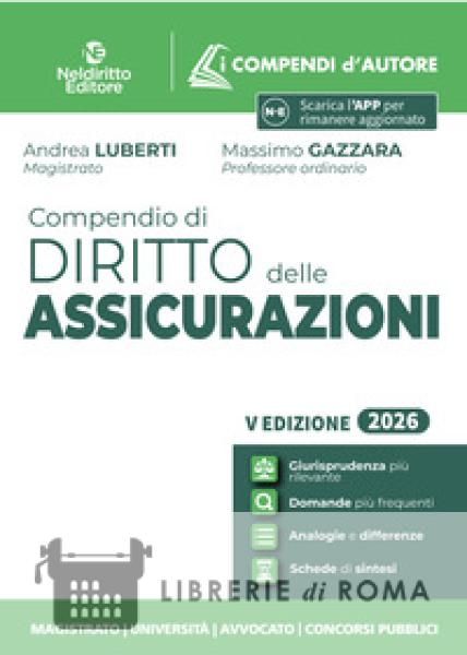 La collana I Compendi d'Autore da circa 20 anni è punto di assoluto riferimento per chi prepara gli esami universitari o le prove di abilitazione forense e dei principali concorsi pubblici. A caratterizzare la Collana sono la chiarezza nella forma, la sinteticità abbinata a completezza nella sostanza. Nell'Edizione 2026 veste grafica, struttura e contenuti sono stati profondamente rivisti per rispondere ancor più efficacemente alle esigenze di chi si prepara. Sul piano grafico, box, grassetti, elenchi puntati, rendono lo studio e la memorizzazione assai più agevoli. Numerosi i nuovi contenuti. (i) L'intera trattazione è attentamente ricalibrata tenendo conto delle domande più frequenti negli esami universitari e nelle prove dei principali concorsi pubblici. (ii) È riportata e citata in appositi Focus dottrinali la Manualistica più utilizzata nelle Università, così da assicurare una preparazione completa. (iii) Si dà inoltre atto in Box giurisprudenziali degli orientamenti interpretativi più rilevanti; (iv) Per i principali istituti, sono messe a fuoco in ulteriori Tabelle, le Analogie e le Differenze per una conoscenza sistematica della materia. Per agevolare il ripasso sono, infine, inseriti in chiusura dei capitoli due ulteriori strumenti: le Schede di sintesi, utilissime per consolidare le conoscenze acquisite; le Domande più frequenti, per saggiare la preparazione. Tra le novità normative, l'Edizione 2026 del Compendio di Diritto delle Assicurazioni tiene conto di importanti innovazioni connesse al più recente sviluppo tecnologico, come quelle introdotte dalla L. 13 giugno 2025, n. 89 in materia di economia dello spazio. Numerosi gli spunti tratti dal più significativo dibattito giurisprudenziale. Completa l'Opera un puntuale Indice analitico.