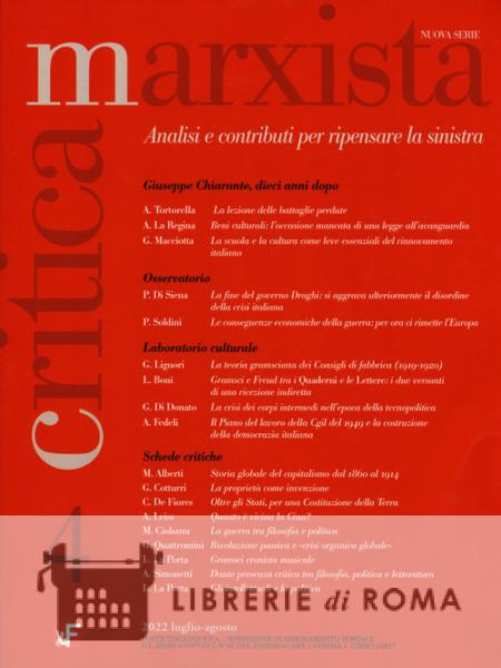 Sommario: Giuseppe Chiarante, dieci anni dopo; Aldo Tortorella, La lezione delle battaglie perdute; Adriano La Regina, Beni culturali: l'occasione mancata di una legge all'avanguardia; Giorgio Macciotta, La scuola e la cultura come leve essenziali del rinnovamento italiano. Osservatorio: Piero Di Siena, La fine del governo Draghi: si aggrava ulteriormente il disordine della crisi italiana; Paolo Soldini, Le conseguenze economiche della guerra: per ora ci rimette l'Europa. Laboratorio culturale: Guido Liguori, La teoria gramsciana dei consigli di fabbrica (1919-1920); Livio Boni, Gramsci e Freud tra i Quaderni e le Lettere: i due versanti di una ricezione indiretta; Giulio Di Donato, La crisi dei corpi intermedi nell'epoca della tecnopolitica; Andrea Fedeli, Il piano del lavoro della Cgil del 1949 e la costruzione della democrazia italiana. Schede critiche: Manfredi Alberti, Storia globale del capitalismo dal 1860 al 1914; Giuseppe Cotturri, La proprietà come invenzione; Claudio De Fiores, Oltre gli Stati, per una Costituzione della Terra; Alberto Leiss, Quanto è vicina la Cina?; Mihaela Ciobanu, La guerra tra filosofia e politica; Giuseppe Quattromini, Rivoluzione passiva e «crisi organica globale»; Lelio La Porta, Gramsci cronista musicale; Alberto simonetti, Dante presenza critica, tra filosofia, politica e letteratura; Lelio La Porta, Gli intellettuali e la politica.
