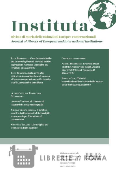 Saggi Luca Bartolucci, Il Parlamento italiano in uno degli snodi cruciali dell'integrazione europea: la ratifica del Trattato di Maastricht Luca Bussotti, Dalla SATO alla ZOPACAS. La costituzione di un'area di pace e cooperazione nell'Atlantico Sud in prospettiva brasiliana A trent'anni dal Trattato di Maastricht / Thirty years from the Maastricht Treaty Antonio Varsori, Il Trattato di Maastricht nella storiografia UbaldoVillani-Lubelli, Il profilo storico-istituzionale del Consiglio Europeo dopo il Trattato di Maastricht Giovanna Tosatti, Alle origini del Comitato delle Regioni Confronti e discussioni / Comparisons and debates Andrea Becherucci, Le fonti archivistiche conservate dagli Archivi Storici dell'UE sul Trattato di Maastricht Ronald Car, Il Global Constitutionalism visto dalla storia delle istituzioni politiche.