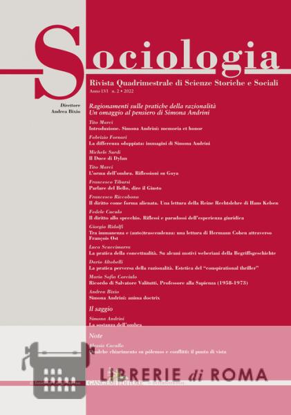 Ragionamenti sulle pratiche della razionalità. Un omaggio al pensiero di Simona Andrini Tito Marci Introduzione. Simona Andrini: memoria et honor Fabrizio Fornari La differenza sdoppiata: immagini di Simona Andrini Michele Surdi Il Duce di Dylan Tito Marci L'orma dell'ombra. Riflessioni su Goya Francesco Tibursi Parlare del Bello, dire il Giusto Francesco Riccobono Il diritto come forma alienata. Una lettura della Reine Rechtslehre di Hans Kelsen Fedele Cuculo Il diritto allo specchio. Riflessi e paradossi dell'esperienza giuridica Giorgio Ridolfi Tra immanenza e (auto)trascendenza: una lettura di Hermann Cohen attraverso François Ost Luca Scuccimarra La pratica della concettualità. Su alcuni motivi weberiani della Begriffsgeschichte Dario Altobelli La pratica perversa della razionalità. Estetica del "conspirational thriller" Maria Sofia Corciulo Ricordo di Salvatore Valitutti, Professore alla Sapienza (1958-1973) Andrea Bixio Simona Andrini: anima doctrix Il saggio Simona Andrini La sostanza dell'ombra Note Alessia Cucullo Qualche chiarimento su pólemos e conflitti: il punto di vista