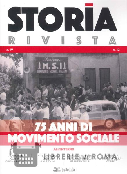 Disponibile il N.12 di Storia Rivista. Editoriale: Una storia italiana di Alessandro Amorese. Storia del MSI. Parte XII: Il MSI per il presidenzialismo di Adalberto Baldoni. Storia a confronto: Crispi e Mussolini: vite parallele di due "uomini forti" di Corrado Soldato. I Monumenti della Storia: L'Alpino di pietra. Quella scultura scomoda di Brunico di Gianandrea Ceresini. Storie del Fascismo: 1921: quando gli squadristi sconfissero Mussolini di Giacinto Reale. Storie della Guerra Civile 1943-45: La rappresaglia tedesca e quella partigiana a Collegno di Michele Tosca. Storie della II Guerra Mondiale: Obiettivo Gorla: il dramma e la memoria degli innocenti di Francesco d'Auria. XXI Secolo: Corsica: la nuova rivolta autonomista di Nicolò Dal Grande. Storie del MSI: Almirante contro la Fallaci di Giorgio Almirante. Libri: L'Alcazar di Brasillach di Carlo Bianco; Protagonisti oltre la destra di Carlo Bianco. DOSSIER: 75 anni di movimento sociale;Dicembre 1946: il MSI, come e perché... di Adalberto Baldoni.