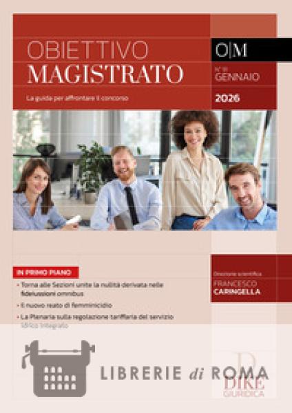 In questo numero della rivista Obiettivo Magistrato numero 91 di Gennaio 2026: Torna alle Sezioni unite la nullità derivata nelle fideiussioni omnibus; Il nuovo reato di femminicidio; La Plenaria sulla regolazione tariffaria del servizio idrico integrato Ogni concorsista, all'inizio della lunga traversata del deserto che separa la laurea dall'accesso al mondo del lavoro, si è trovato di fronte alla domanda fatidica: quale rivista mi serve per superare il concorso in magistratura? Obiettivo magistrato risponde, in modo netto e preciso, a questo interrogativo. È un prodotto editoriale di nuova generazione, una rivista di scopo, concepita per fare il punto, nei mesi che separano il bando dalle prove scritte, su tutti gli argomenti che possono essere oggetto d'esame. Il progetto editoriale risponde, allora, per ognuna delle tre materie delle prove scritte, a tre bisogni fondamentali: a) la guida ragionata allo studio, attraverso l'analisi degli istituti fondamentali e attuali; b) il monitoraggio, con ricchissimi osservatori, delle sentenze più recenti e significative; c) l'apprendimento di una buona tecnica di redazione degli elaborati, con numerosi esercizi (compiti e schemi) e tracce svolte. L'avventura che attende l'aspirante magistrato è lunga e faticosa, ma anche e soprattutto appassionante. Vogliamo condurre per mano ciascun concorsista fino alle fatidiche giornate delle prove scritte, vivendo insieme questo momento, con gioia e incoscienza, non solo tramite la rivista Obiettivo magistrato di Gennaio 2026 ma anche attraverso i libri per magistratura Dike. Scopri inoltre il nuovo portale di informazione giuridica digitale, gratuito ed accessibile a tutti: ilDiritto.it Direzione scientifica Francesco Caringella.
