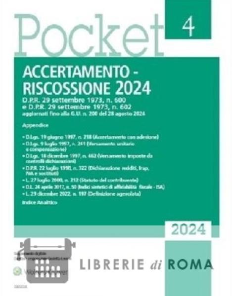 Il Pocket il fisco Accertamento e riscossione 2024 contiene il testo del D.P.R. 29 settembre 1973, n. 600 e del D.P.R. 29 settembre 1973, n. 602 aggiornati con le novità introdotte dalla Legge di bilancio 2024 e dai decreti correttivi ed integrativi pubblicati fino ad agosto 2024. In Appendice sono riportati, in estratto, i provvedimenti in materia di: dichiarazione precompilata; monitoraggio fiscale; interpello dell'Amministrazione finanziaria e conto fiscale; autotutela da parte degli uffici; accertamento con adesione; studi di settore; presentazione dichiarazioni redditi, IRAP, IVA e sostituti; Statuto dei diritti del contribuente; regime premiale per la trasparenza; iscrizioni a ruolo. versamenti unitari e compensazioni.