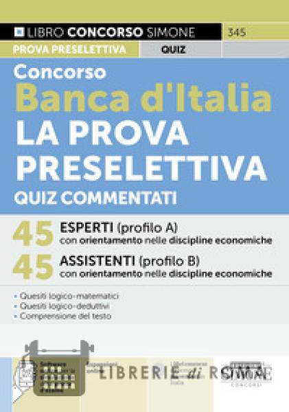 Il libro dei Quiz commentati per il Concorso Banca d'Italia per La prova preselettiva dei 45 Esperti (profilo A) e 45 Assistenti (profilo B) con orientamento nelle discipline economiche costituisce un utile supporto per prepararsi a questa prima fase della procedura concorsuale. Il test preselettivo è costituito da 60 quesiti, da svolgere in massimo 75 minuti: logico-matematici; logico-deduttivi; di comprensione del testo. Il manuale raccoglie tutte le varie tipologie di quiz di logica richieste dal bando, commentati, ciascuna delle quali è preceduta da una breve introduzione in cui sono spiegati i metodi più efficaci per la loro risoluzione. Il libro dei Quiz commentati per la prova preselettiva del Concorso Banca d'Italia è così strutturato: Parte I - Ragionamento critico-verbale (comprensione dei brani; termini e modi di dire; coppie di parole ecc.); Parte II - Logica deduttiva (brani con relazione d'ordini; deduzioni, sillogismi e negazioni; relazioni di ordine e grandezza ecc.) Parte III - Ragionamento logico-matematico (serie numeriche, alfabetiche e alfanumeriche; ragionamento matematico e problem solving; problem solving con calcolo delle percentuali e probabilità ecc.). Grazie al software online, con migliaia di quiz, è possibile esercitarsi in modo efficace per la prova d'esame.