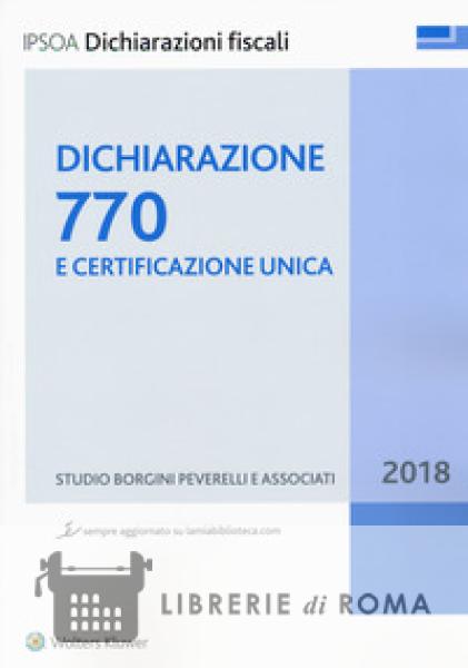 La collana "Dichiarazioni fiscali" si conferma un valido strumento per il professionista a cui assicura risposte immediate attraverso l'applicazione del metodo howto: ogni quadro è preceduto da una tabella iniziale riassuntiva delle principali novità, soggetti obbligati ed esclusi, scadenza, guida alla compilazione. Il volume è pubblicato ne "La mia Biblioteca" con la formula "Aggiornati sempre" che consente la consultazione della versione digitale aggiornata in tempo reale con tutte le novità. Nel volume, ampio spazio è riservato alla specifica trattazione dei casi più significativi di compilazione e delle relative esemplificazioni numeriche quadro per quadro. Il volume tiene conto del modello dichiarazione 770 2018 e Certificazione unica con le relative istruzioni approvati con Provvedimento dell'Agenzia delle Entrate del 15 gennaio 2018. A partire da quest'anno la scadenza per la trasmissione telematica dei modelli è così determinata: 7 marzo per la trasmissione telematica della CU; 31 marzo (3 aprile per il 2018) per la consegna della CU ai lavoratori dipendenti; 31 ottobre per la dichiarazione 770 unificata. La certificazione unica si arricchisce di nuovi campi nella sezione riservata ai premi di risultato e al welfare.