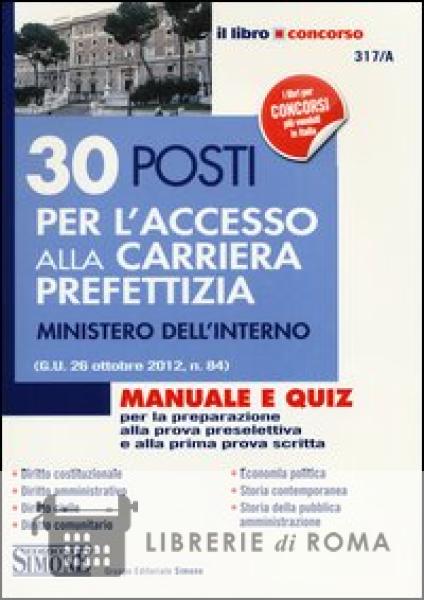 Nella Gazzetta Ufficiale del 26 ottobre 2012, n. 84 e stato pubblicato il bando del concorso pubblico, per titoli ed esami, a 30 posti per l'accesso alla qualifica iniziale della carriera prefettizia. Le prove scritte ed orali sono precedute da una prova preselettiva, consistente nella risoluzione di quesiti a risposta multipla relativi ad argomenti che potranno essere scelti tra le seguenti discipline: diritto costituzionale; diritto amministrativo; diritto civile; diritto comunitario; economia politica; storia contemporanea. Per venire incontro alle esigenze di quanti affronteranno questo concorso, il volume e stato suddiviso in due parti: la Parte Prima comprende, per ciascun libro, la trattazione manualistica delle materie sopra citate, aggiornata alle più recenti novità legislative, oltre ad una approfondita disamina della Storia della Pubblica Amministrazione, disciplina prevista per la sola prova scritta; la Parte Seconda, anch'essa suddivisa in libri, e costituita da batterie di quiz con quattro ipotesi di soluzione per ogni singola domanda, ripartite per argomenti in relazione alle materie esaminate. I quesiti sono altresì suddivisi per grado di difficoltà, in relazione alla natura della domanda che, come previsto nel bando di concorso, potrà essere facile, di media difficoltà o difficile. Per come concepita, dunque, l'opera consente una completa ed esauriente preparazione finalizzata ad un agevole superamento delle prove.
