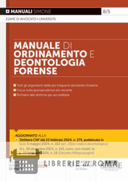 Il Manuale di Ordinamento e Deontologia Forense tratta in maniera approfondita l'ordinamento forense, regolato dalla L. 247/2012, e le norme del codice deontologico, emanato dal Consiglio Nazionale Forense. Il testo è stato completamente ripensato, dandogli questa nuova veste, allo scopo di trattare gli argomenti in maniera innovativa, dando il giusto spazio agli approfondimenti normativi e giurisprudenziali e alle novità legislative senza, tuttavia, sacrificare l'esposizione semplice e immediata volta a facilitare lo studio e l'apprendimento. Il manuale si suddivide in due parti: la prima è dedicata all'ordinamento forense, la seconda alla deontologia, con particolare attenzione al procedimento disciplinare, illustrato dalla fase iniziale a quella conclusiva. In chiusura, viene analizzato il codice deontologico europeo vista la crescente importanza del diritto europeo nell'esercizio della professione forense. Tra le novità legislative trattate nel nuovo manuale si evidenzia la legge sull'equo compenso (L. 49/2023), che assume rilevanza anche dal punto di vista disciplinare. Infatti, al fine di dare seguito alla nuova legislazione in materia, il Consiglio Nazionale Forense ha introdotto, nella seduta del 23 febbraio 2024, l'art. 25bis rubricato «violazioni delle disposizioni in materia di equo compenso». Per le sue caratteristiche, il Manuale è rivolto a chi affronta la preparazione dell'esame per l'abilitazione alla professione di avvocato, nonché al professionista che abbia la necessità di aggiornarsi e di seguire le novità della materia. Scopri tutti i testi dedicati all'Esame Avvocato 2024, compresi i libri per la prova orale di diritto civile e penale.