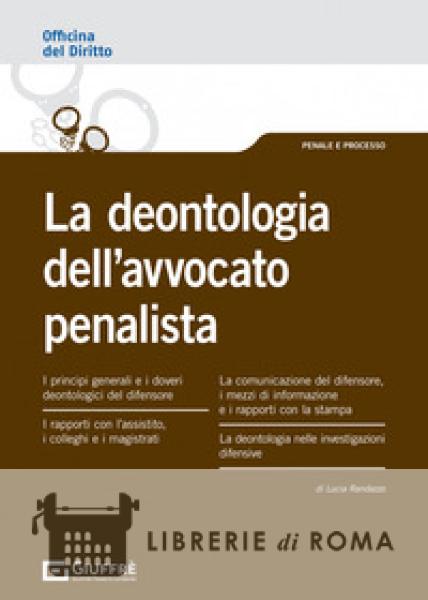 Officina del diritto: è uno strumento di lavoro e di studio pensato per arricchire le proprie conoscenze giuridiche attraverso un sistema di lettura strutturato su più livelli: uno più immediato che consente di focalizzare i concetti "guida" di una precisa fattispecie giuridica con l'utilizzo di esempi, tavole sinottiche, schemi, formule, quesiti, mappe giurisprudenziali, e un altro più approfondito che illustra organicamente la materia e nel quale si rinvengono informazioni puntuali e chiarimenti mirati di pronta fruibilità. L'opera "La deontologia dell'avvocato penalista" affronta i seguenti temi: I principi generali e i doveri deontologici del difensore; La comunicazione del difensore, i mezzi di informazione e i rapporti con la stampa; La deontologia nelle investigazioni difensive.