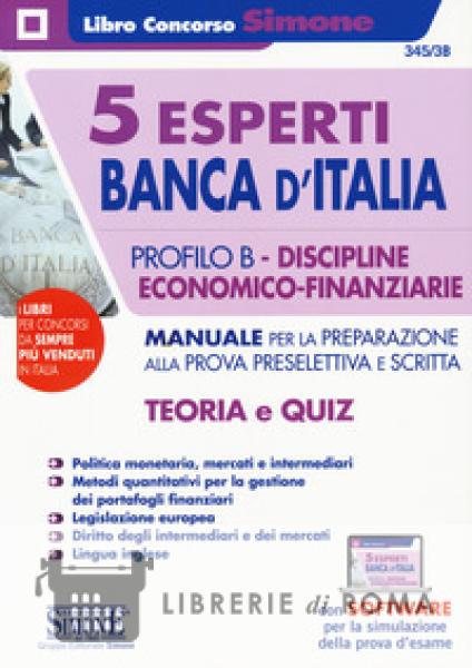 Il 27 agosto 2019 e stato pubblicato il bando di concorso per 55 posizioni per vari profili di Esperti presso la Banca d'Italia, tra cui 5 con orientamento nelle discipline economico-finanziarie (profilo B). Il bando prevede una procedura di selezione articolata in una prova preselettiva sulle materie della prova scritta e sulle competenze in lingua inglese, una prova scritta consistente nello svolgimento di quattro quesiti a risposta sintetica e una prova in lingua inglese, oltre che una successiva prova orale. Questo volume, pensato specificamente per la preparazione al profilo B, costituisce un importante strumento di studio in vista della prova preselettiva e della prova scritta: affronta, infatti, gli argomenti del programma d'esame previsto dal bando, che contempla tematiche specifiche e altamente professionalizzanti. A tal fine il testo, aggiornato alle più recenti novità normative, comprende una parte manualistica che sviluppa le seguenti materie: - Politica monetaria, mercati e intermediari; - Metodi quantitativi per la gestione dei portafogli finanziari, la valutazione dei rischi e la misurazione della performance; - Legislazione europea, diritto degli intermediari e dei mercati. Oltre alla parte manualistica, vi e una sezione contenente centinaia di quiz a risposta multipla per la prova in lingua inglese. Il volume si arricchisce, inoltre, di espansioni online con approfondimenti utili per la preparazione, nonché di un software, con innumerevoli quiz per infinite simulazioni della prova preselettiva (accessibili tramite il QrCode posto all'interno del volume). L'appendice riporta, infine, la traccia estratta dei quesiti a risposta sintetica assegnati in occasione del precedente concorso per 10 esperti svoltosi nel 2018.