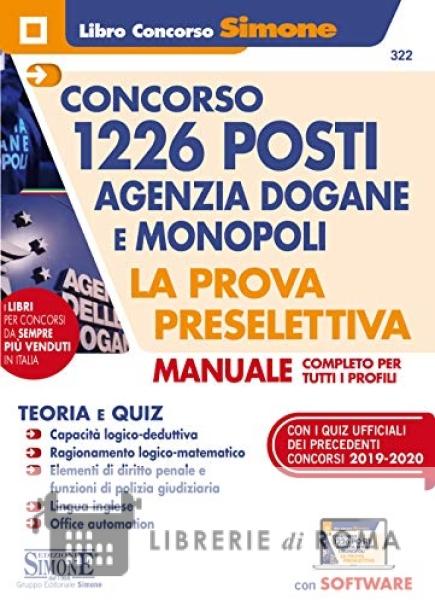 Sulla G.U. n. 78 del 6-10-2020 l'Agenzia delle Dogane e dei Monopoli ha bandito due concorsi per la copertura di complessivi 1226 posti per varie figure professionali, di cui 766 da inquadrare nella terza area (fascia retributiva F1) e 466 nella seconda area (fascia retributiva F3). Questo volume costituisce un indispensabile strumento di preparazione alla prova preselettiva valida per tutti i profili e, aderendo perfettamente ai bandi, propone teoria e quiz in materia di: Capacita logico-deduttiva, con schede esplicative e test di verifica su: Serie di termini; Analogie verbali; Ragionamento verbale con coppie di parole; Relazioni di ordine e grandezza; Brani con relazioni d'ordine; Deduzioni semplici; Negazioni; Condizione sufficiente / necessaria / necessaria e sufficiente; Sillogismi; Capacita visiva, di attenzione e precisione; Ragionamento geometrico-spaziale; Serie e analogie figurali; Ragionamento logico-matematico, con schede esplicative e test di verifica su: Serie numeriche, alfabetiche, alfanumeriche; Abbinamenti lettere/numeri; Equazioni simboliche; Aritmetica, algebra, problem solving; Calcolo delle percentuali e delle probabilità; Configurazioni geometriche con logica numerica; Grafici e tabelle; Elementi di diritto penale e funzioni di polizia giudiziaria; Lingua inglese; Office automation. A completamento dell'opera, un software, accessibile tramite QR-Code, con tutti i quesiti contenuti nel testo e, soprattutto, con migliaia di quiz ufficiali dei precedenti concorsi 2019-2020 banditi dall'Agenzia delle Dogane e dei Monopoli. Per maggiore completezza della trattazione, un'apposita Espansione Web propone schede esplicative e test di verifica di Logica verbale (Sinonimi, contrari, associazioni di parole; Significati di termini e modi di dire; Anagrammi; Termini e frasi da completare; Comprensione di brani), poiché in qualche concorso precedente e capitato che, anche se questa materia non era espressamente inclusa nel programma della prova preselettiva, alcuni quiz di Logica verbale siano comunque stati somministrati ai candidati in sede d'esame.