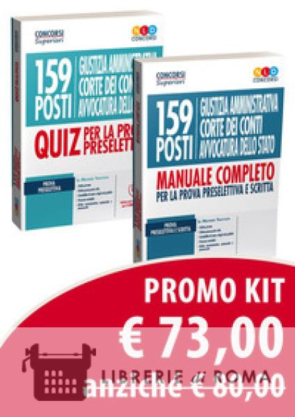 Il Kit è composto da: manuale di preparazione 159 posti Giustizia Amministrativa, Corte dei Conti, Avvocatura dello Stato; quiz di preparazione 159 posti Giustizia Amministrativa, Corte dei Conti, Avvocatura dello Stato.