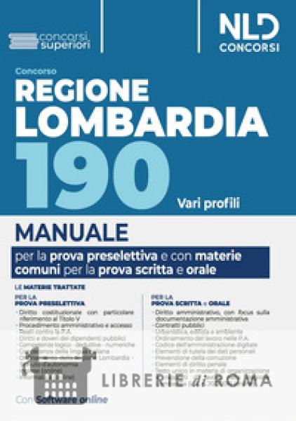 La Giunta della Regione Lombardia ha pubblicato un bando di concorso per complessivi 190 unità da destinare nell'area dei Funzionari e dell'Elevata qualificazione in vari profili professionali. NLD Concorsi ha predisposto il Manuale Regione Lombardia 190 Vari profili, per venire incontro alle specifiche esigenze di chi deve prepararsi ad affrontare le prove concorsuali, preselettiva e scritta.