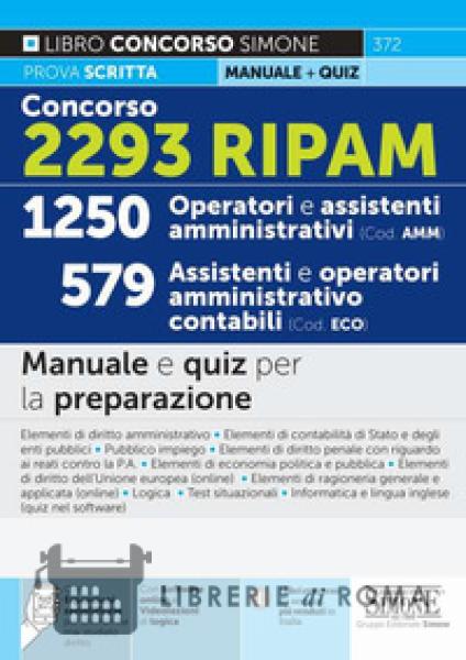 Manuale Concorso Ripam 2022 per la preparazione del profilo amministrativo e contabile. Bandito il maxi concorso Ripam 2022 per nuove assunzioni di 2.293 unità di personale non dirigenziale a tempo indeterminato di diversi profili. Il bando, pubblicato in Gazzetta Ufficiale Concorsi del 31 dicembre 2021, è aperto a coloro che sono in possesso di un diploma di scuola secondaria di secondo grado. Dalla premessa: Il Manuale Concorso 2293 RIPAM e destinato alla preparazione dell'unica prova scritta del concorso bandito dalla Presidenza del Consiglio dei Ministri (pubblicato in G.U. Concorsi n. 104 del 31-12-2021) per i seguenti profili: 1250 Operatori amministrativi/assistenti amministrativi/assistenti amministrativo gestionali (cod. AMM) e 579 Assistenti amministrativo contabili/operatori amministrativo contabili/assistenti economico-finanziari (cod. ECO). La prova scritta consiste in un test di 40 quesiti a risposta multipla da risolvere in 60 minuti, di cui 25 volti a verificare le conoscenze rilevanti afferenti alle seguenti materie: Per il codice di concorso AMM: Elementi di diritto amministrativo; Elementi di diritto penale con riguardo ai reati contro la pubblica amministrazione; Elementi di contabilità di Stato e degli enti pubblici; Elementi di diritto dell'Unione europea; Norme generali in materia di pubblico impiego, con particolare riferimento alle responsabilità, doveri e diritti dei pubblici dipendenti, codice di comportamento e sanzioni disciplinari; Uso delle apparecchiature e delle applicazioni informatiche più diffuse; Conoscenza della lingua inglese; Per il codice di concorso ECO: Elementi di diritto amministrativo; Elementi di contabilità di Stato e degli enti pubblici; Elementi di ragioneria generale ed applicata; Elementi di economia politica e pubblica; Norme generali in materia di pubblico impiego, con particolare riferimento alle responsabilità, doveri e diritti dei pubblici dipendenti, codice di comportamento e sanzioni disciplinari; Uso delle apparecchiature e delle applicazioni informatiche più diffuse; Conoscenza della lingua inglese. Inoltre, per entrambi i profili, sono previsti 7 quesiti volti a verificare la capacita logico deduttiva e di ragionamento critico-verbale e 8 quesiti situazionali relativi a problematiche organizzative e gestionali. Il manuale, pertanto, tratta le materie richieste per ciascun profilo ed e cosi strutturato: Parte I - Elementi di diritto amministrativo; Parte II - Norme generali in materia di pubblico impiego; Parte III - Elementi di contabilità di Stato e degli enti pubblici; Parte IV - Elementi di diritto penale con riguardo ai reati contro la P.A. (cod. AMM); Parte V - Elementi di economia politica e pubblica (cod. ECO); Parte VI - Logica - Quiz commentati; Parte VII - Quesiti situazionali commentati; Parte VIII - Elementi di diritto dell'Unione europea (cod. AMM) - online; Parte IX - Elementi di ragioneria generale e applicata (cod. ECO) - online; Informatica e Lingua inglese - quiz nel software. A completare il testo, espansioni semplificate per coloro che non hanno mai studiato diritto, 29 videolezioni di logica e un software, suddiviso per profili, con migliaia di quiz, che permette di esercitarsi con infinite simulazioni della prova d'esame. Tutti i contenuti online sono disponibili nell'area riservata accessibile tramite Qr code posto sull'ultima pagina di questo libro. Tutte le informazioni sul maxi bando da 2.293 posti: profili disponibili, modalità di presentazione della domanda, prove e bando.