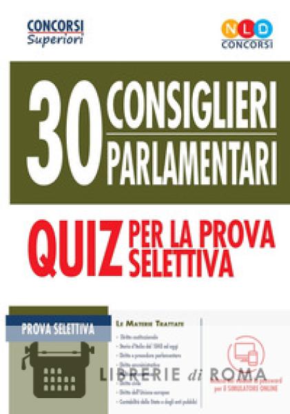 In data 30 luglio 2019, è stato indetto dalla Camera dei Deputati un concorso per esami a 30 posti di consigliere parlamentare della professionalità generale. Lo svolgimento della prova d'esame consiste in una prova selettiva, sei prove scritte e una prova orale. La prova selettiva ha a oggetto le seguenti materie: diritto costituzionale; storia d'Italia dal 1848 a oggi; diritto e procedura parlamentare; diritto amministrativo; politica economica; diritto civile; diritto dell'Unione europea; contabilità dello Stato e degli enti pubblici. Il presente volume costituisce un valido ed efficace strumento per la preparazione alla prova selettiva del concorso. Il testo è suddiviso in due parti: una prima parte composta dai quiz commentati e una seconda parte composta dai quiz non commentati. Mediante i quiz commentati il candidato può comprendere le nozioni alla base del singolo quiz. Invece, mediante i quiz non commentati, il candidato può mettersi alla prova memorizzando i singoli concetti in maniera pratica. Il volume consente di testare diffusamente le proprie conoscenze e la propria preparazione su tutte le materie oggetto del bando, permettendo al candidato, mediante l'accesso al simulatore online, di esercitarsi su vere e proprie simulazioni della prova d'esame.