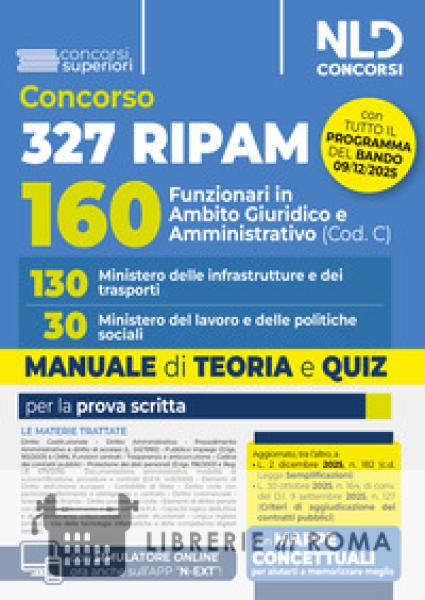Concorso 327 posti Ripam Manuale per il Concorso 160 Funzionari MIT e Ministero del Lavoro e delle Politiche Sociali con Teoria e quiz (cod. C) Un importante concorso pubblico, per titoli ed esami, è stato indetto per il reclutamento di n. 327 Funzionari, di cui: n. 161 con competenze in ambito amministrativo/giuridico/economico presso gli Uffici centrali di Roma del Ministero delle imprese e del made in Italy (Cod. A); n. 6 con competenze in ambito statistico presso gli Uffici centrali di Roma del Ministero delle imprese e del made in Italy (Cod. B); n. 160 con competenze in ambito giuridico e amministrativo di cui n. 130 unità presso il MIT e n. 30 unità presso il Ministero del lavoro e delle politiche sociali (Cod. C). La procedura è affidata ad una prova scritta distinta per codici di concorso e alla successiva valutazione dei titoli. Il Volume MIT e Ministero del Lavoro e delle politiche sociali, 160 Funzionari giuridico-amministrativi (Cod. C), Teoria e Quiz, NLD Concorsi, 2025 è stato predisposto in assoluta conformità al Bando contenendo una trattazione completa, aggiornata e, al contempo, schematica e fluida di tutte le materie: Diritto costituzionale; Diritto amministrativo; Elementi di diritto dell'Unione Europea; Contabilità di Stato; Diritto civile, con particolare riferimento a obbligazioni e contratti; Diritto commerciale; Elementi di scienza delle finanze; Elementi di diritto processuale civile; Elementi di diritto penale, con particolare riferimento ai reati contro la P.A.; Capacità logico-deduttive e di ragionamento critico-verbale; Quesiti situazionali; Lingua inglese (online); Uso delle tecnologie informatiche e delle competenze digitali (online). Il Volume tiene conto delle più recenti novità normative, tra cui la L. 2 dicembre 2025, n. 182 (c.d. Legge Semplificazioni), la L. 30 ottobre 2025, n. 164, di conv. del D.l. 9 settembre 2025, n. 127 (Criteri di aggiudicazione dei contratti pubblici) e la L. 23 settembre 2025, n. 132 (Intelligenza artificiale). Per consentire di affiancare allo studio teorico una immediata verifica della acquisita capacità di risolvere i corrispondenti test, il Manuale presenta quiz di verifica suddivisi per ciascuna Parte o per singoli Capitoli. Abbina al Manuale il Corso on line Lezioni, simulazioni e correzioni personalizzate, NLD, per una preparazione ancor più efficace. Il Manuale permette, infine, l'accesso ad un'estensione online consultabile con apposita password per rimanere sempre aggiornati sulle materie trattate e per accedere al simulatore online.