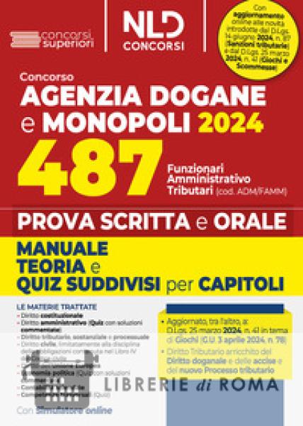 Aggiornato ai D.lgs. 25 marzo 2024 n. 41 Giochi e scommesse L'Agenzia delle Dogane e dei Monopoli ha indetto un concorso per la copertura di 564 posti a tempo pieno e indeterminato di cui: 487 Funzionari Amministrativi Tributari (cod. ADM/ FAMM); 5 Funzionari Amministrativi Tributari, esperti in comunicazione (cod. ADM/COM) 72 Funzionari Tecnici Professionali (cod. ADM/ING). NLD Concorsi ha predisposto il Manuale per la prova scritta del Concorso 487 Agenzia delle Dogane e dei Monopoli profilo cod. ADM/FAMM, teoria e quiz, per venire incontro alle specifiche esigenze di chi deve prepararsi ad affrontare le prove scritte e orali. Il manuale contiene una trattazione delle seguenti materie: Diritto costituzionale; Diritto amministrativo (Quiz con soluzioni commentate); Diritto tributario, sostanziale e processuale; Diritto civile, limitatamente alla disciplina delle obbligazioni contenuta nel Libro IV del Codice civile; Diritto dell'Unione europea...