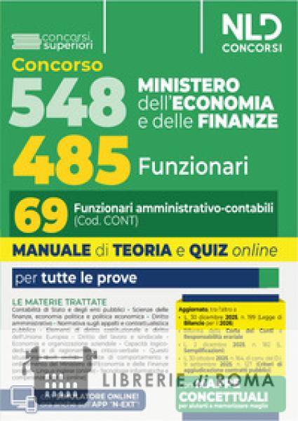 Concorso 548 Ministero dell'Economia e delle Finanze di cui 485 Funzionari. Manuale per il profilo da 69 Funzionari amministrativo contabili completo di teoria e quiz. È stato indetto un importante concorso pubblico su base territoriale, per il reclutamento di un contingente complessivo di n. 548 unità di personale non dirigenziale, a tempo pieno e indeterminato, di cui n. 63 unità da inquadrare, con selezione per titoli ed esami, nell'Area delle elevate professionalità en. 485 unità da inquadrare, con selezione per esami, nell'Area dei funzionari dei ruoli del Ministro dell'economia e delle finanze, così ripartiti: n. 150 Funzionari giuridico-legali (Cod. GIUR); n. 111 Funzionari economici-finanziari (Cod. ECON); n. 78 Funzionari giuridico-tributari (Cod. TRIB); n. 69 Funzionari amministrativo-contabili (Cod. CONT); n. 30 Funzionari statistici (Cod.STAT); n. 26 Funzionari informatici (Cod.INF); n. 10 Funzionari esperti in rapporti internazionali ed europei (Cod.INT-EU); n. 6 Funzionari esperti in intermediazione finanziaria( Cod.LEGFIN); n.5 Funzionari esperti in analisi e ricerca economico - finanziaria (Cod. ECOFIN). La procedura concorsuale è affidata ad una preselettiva eventuale, una prova scritta ed una orale. Il Manuale 548 Ministero dell'Economia e delle Finanze. 485 Funzionari. 69 Funzionari amministrativo contabili (Cod. CONT), Teoria e Quiz, NLD Concorsi, 2026 è stato appositamente ideato e realizzato per venire incontro alle specifiche esigenze di chi deve prepararsi ad affrontare le prove concorsuali. Il Volume si caratterizza per una trattazione completa, aggiornata e, al contempo, schematica e fluida delle seguenti materie: Contabilità di Stato e degli enti pubblici; Scienze delle finanze, economia politica e politica economica; Diritto amministrativo; Normativa sugli appalti e contrattualistica pubblica; Elementi di diritto costituzionale e diritto dell'Unione Europea; Diritto del lavoro e sindacale; Economia e organizzazione aziendale; Capacità logico-deduttiva e di ragionamento critico-verbale; Quesiti situazionali (soft skills); Codice di comportamento e ordinamento del Ministero dell'Economia e delle Finanze (online); Lingua inglese(online); Tecnologie informatiche e competenze digitali (online). Il Volume è aggiornato alle più recenti novità legislative, tra cui la Legge di Bilancio per il 2026, la legge di riforma della Corte dei Conti e della responsabilità erariale, L. 2 dicembre 2025, n. 182 (L. Semplificazioni) e la L. 30 ottobre 2025, n. 164, di conv. del D.l. 9 settembre 2025, n. 127 (Criteri di aggiudicazione contratti pubblici). Per consentire di affiancare allo studio teorico una immediata verifica della acquisita capacità di risolvere i corrispondenti test, il Manuale presenta quiz di verifica suddivisi per ciascuna Parte o per singoli Capitoli. Il Volume permette, infine, l'accesso ad un'estensione online consultabile con apposita password per rimanere sempre aggiornati sulle materie trattate e per accedere al simulatore online. Abbina al Manuale il Corso online Simulazioni e correzioni personalizzate, per una preparazione ancora più efficace.