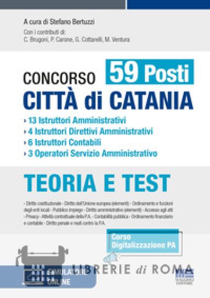 Il volume si presenta come strumento di studio per tutte le prove del Concorso per 59 posti indetto dal Comune di Catania per i seguenti profili: 13 Istruttori Amministrativi; 4 Istruttori Direttivi Amministrativi; 6 Istruttori Contabili; 3 Operatori Servizio Amministrativo. Il testo propone una trattazione teorica sulle materie richieste ai candidati durante le prove concorsuali, ovvero: Diritto costituzionale; Diritto dell'Unione europea (elementi); Ordinamento e funzioni degli enti locali; Pubblico impiego; Diritto amministrativo (elementi); Accesso agli atti; Privacy; Attività contrattuale della P.A.; Contabilità dello Stato e degli enti locali; Ordinamento finanziario e contabile degli enti locali; Diritto penale e reati contro la P.A.. Ogni sezione è seguita da una selezione di quiz a risposta multipla svolti e commentati per un breve ripasso e una rapida verifica di quanto appreso. Nella sezione online collegata, raggiungibile seguendo le istruzioni riportate in fondo al libro, sono disponibili anche: quiz di lingua inglese con risposta commentata; teoria e quiz di informatica; simulatore di quiz; videolezioni su Documentazione e certificazione amministrativa e digitalizzazione della P.A. A cura di Stefano Bertuzzi. Con i contributi di: C. Brugoni, P. Carone, G. Cottarelli, M. Ventura.