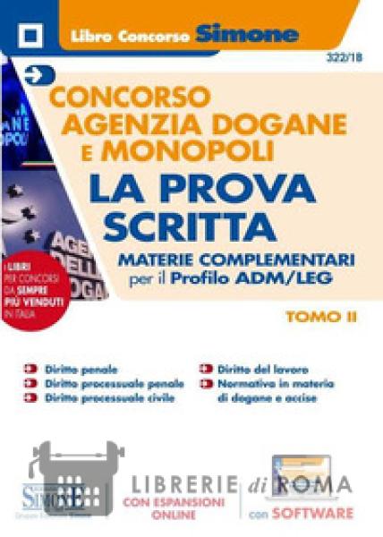 Il manuale Concorso Agenzia delle Dogane e dei Monopoli. Materie complementari per il profilo ADM/LEG (funzionario doganale-esperto giuridico-legale e contenzioso) è diretto alla preparazione della prova scritta del concorso. Il testo è suddiviso in due Tomi. Questo Tomo II comprende la trattazione teorica delle seguenti materie: Diritto penale; Diritto processuale penale; Diritto processuale civile; Diritto del lavoro; Normativa in materia di dogane e accise (online). La preparazione alla prova d'esame deve essere completata con lo studio del Tomo I (Materie giuridiche, cod. 322/1), che tratta le seguenti discipline: Diritto costituzionale, Diritto amministrativo, Diritto tributario, Diritto civile, Diritto commerciale, Diritto dell'Unione europea e Diritto internazionale. Grazie al software online, sarà possibile esercitarsi con infinite simulazioni della prova concorsuale. Per chi è in possesso sia del Tomo I che del Tomo II, il software comprende i test relativi alle materie affrontate in entrambi. Il manuale, inoltre, si completa con espansioni online.