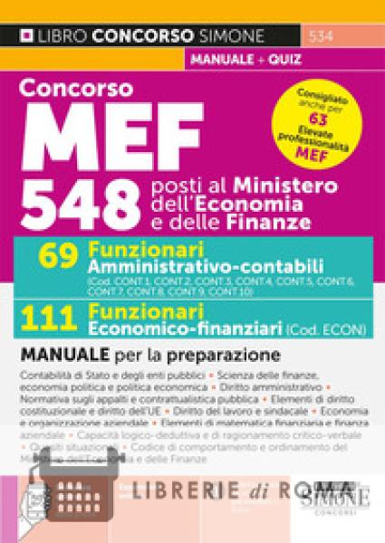 Librerie di Roma | Concorso MEF 548 posti. 69 funzionari amministrativo-contabili. 111 funzionari economico-finanziari. Manuale per la preparazione