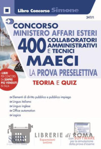 Il manuale è indirizzato alla preparazione della prova preselettiva della procedura concorsuale (G.U. 26-2-2021, n. 16). La prova preselettiva è comune a tutti i profili professionali ricercati dal MAECI (collaboratori amministrativi, contabili e consolari) e consiste in un test a risposta multipla sulle materie previste dal concorso. Il testo, pertanto, seguendo il programma del bando è così strutturato: Parte I - Elementi di diritto pubblico con particolare riferimento al rapporto di pubblico impiego (teoria); Parte II - Lingua italiana (fonologia e ortografia, morfologia, sintassi, capacità verbale) ? in espansione online); Parte III - Lingua inglese (schede grammaticali); Parte V - Office automation (Word processor, Foglio elettronico, Presentazioni elettroniche, Database e relativi quiz) ? in espansione online; Parte IV - Logica (test di logica-deduttiva, di ragionamento logico-matematico e critico verbale); Parte V - Quiz di logica anglosassone ? in espansione online; Parte VI - Quiz disciplinari (Elementi di diritto pubblico con particolare riferimento al rapporto di pubblico impiego; Lingua italiana; Lingua inglese). Il manuale si completa con espansioni online di approfondimento e un software per esercitarsi nel miglior modo possibile per la prova preselettiva.