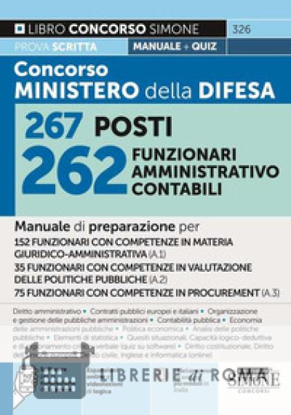 Il manuale è diretto alla preparazione della prova scritta prevista dalla procedura concorsuale per il reclutamento di 262 funzionari nell'ambito amministrativo, contabile, linguistico, giudiziario e storico-culturale. Il libro per il Concorso da 267 funzionari al Ministero della Difesa è rivolto, in particolare, ai seguenti profili professionali: 52 unità con competenze in materia giuridico-amministrativa (codice A.1); 35 unità con competenze in valutazione delle politiche pubbliche (codice A.2); 75 unità con competenze in procurement (codice A.3). Il manuale, seguendo il programma del bando, è così strutturato: Parte I, Diritto amministrativo; Parte II, Organizzazione e gestione delle pubbliche amministrazioni; Parte III, Disciplina dei contratti pubblici europei e italiani; Parte IV, Economia delle amministrazioni pubbliche; Parte V, Contabilità pubblica; Parte VI, Politica economica; Parte VII, Analisi delle politiche pubbliche; Parte VIII, Elementi di statistica; Diritto costituzionale (online); diritto dell'Unione europea (online); Diritto civile (obbligazioni e contratti, responsabilità contrattuale ed extracontrattuale) (online); Inglese (online); Informatica (online); Capacità logico-deduttiva e di ragionamento critico-verbale (quiz su software); Quesiti situazionali (quiz su software). Per ciascun profilo è predisposto un software online per esercitarsi in modo efficace in vista della prova scritta, che consiste in un test con quesiti a risposta multipla. Sempre online sono disponibili espansioni di approfondimento e normative. Il libro Concorso Ministero della Difesa Edizione 2024 fornisce in coda, inoltre, una tabella di corrispondenza delle materie d'esame richieste per i vari profili con i contenuti del manuale.