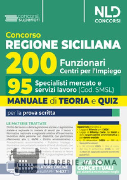 È indetto un concorso pubblico per esami, per il reclutamento di complessive n.200 unità di personale non dirigenziale, a tempo pieno e indeterminato, con inquadramento giuridico ed economico nell'Area dei Funzionari per il potenziamento dei Centri per l'impiego della Sicilia, nei seguenti profili professionali: n. 80 Specialisti amministrativi contabili (Cod. SAC); n. 95 Specialisti mercato e servizi lavoro (Cod. SMSL); n. 25 Specialisti informatici statistici (Cod. SIST). La procedura concorsuale è affidata ad una unica prova selettiva scritta. Il Volume Concorso Regione Sicilia. 200 Funzionari,95 Specialisti mercato e servizi lavoro, Teoria e Quiz. NLD Concorsi 2026, è stato realizzato per venire incontro alle specifiche esigenze di chi deve affrontare la prova concorsuale. Il Volume si caratterizza per una trattazione completa, aggiornata e, al contempo, schematica e fluida delle seguenti materie: Diritto del lavoro e della legislazione sociale; Legislazione statale e regionale in materia di servizi per il lavoro, normativa nazionale e regionale relativa all'inserimento lavorativo delle persone con disabilità, con particolare riferimento alla L. 68/99; Diritto amministrativo, con particolare riferimento a procedimento amministrativo e disciplina del pubblico impiego; Normativa comunitaria in materia di fondi strutturali, con particolare riferimento al Fondo Sociale Europeo e programmazione regionale in materia di servizi al lavoro e politiche attive a valere sul FSE; Lingua inglese (online); Informatica (online). Il Volume tiene conto delle più recenti novità legislative, tra cui quelle introdotte dalla Legge di Bilancio per il 2026, L. 02 dicembre 2025, n. 182 (c.d. Legge Semplificazioni) e dalla L. 30 ottobre 2025, n. 164, di conv. del D.l. 9 settembre 2025, n. 127 (Criteri di aggiudicazione dei contratti pubblici). Ulteriori aggiornamenti alle più importanti leggi approvate dopo la pubblicazione del Volume saranno resi disponibili online. Per consentire di affiancare allo studio teorico una immediata verifica della acquisita capacità di risolvere i corrispondenti test, il Manuale presenta quiz di verifica suddivisi per ciascuna Parte o per singoli Capitoli che compongono le indicate materie. Il Manuale Regione Siciliana. 200 Funzionari, 95 Specialisti mercato e servizi lavoro, Teoria e Quiz. NLD Concorsi 2026, permette, infine, l'accesso ad un'estensione online, consultabile con apposita password, per rimanere aggiornati sulle materie oggetto d'esame, per accedere alle mappe concettuali e per esercitarsi con il simulatore online.
