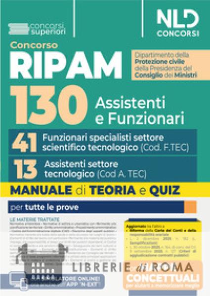 Manuale Concorso Ripam 130 posti alla Protezione civile per i profili di 41 Funzionari specialisti di settore scientifico tecnologico (Cod. F.TEC) e 13 Assistenti di settore tecnologico (Cod. A.TEC), Teoria e Quiz È stato indetto un importante concorso pubblico, per titoli ed esami, per il reclutamento di un contingente complessivo di n. 130 unità di personale non dirigenziale, a tempo pieno e indeterminato, da inquadrare nei ruoli del Dipartimento della Protezione civile della Presidenza del Consiglio dei Ministri, di cui n. 90 Funzionari e n. 40 Assistenti. La procedura concorsuale è affidata ad una eventuale prova preselettiva, una prova scritta, una prova orale e nella successiva valutazione dei titoli. Il Manuale Ripam 130 Dipartimento della Protezione civile della Presidenza del Consiglio dei Ministri. 41 Funzionari specialisti di settore scientifico tecnologico (Cod. F.TEC) e 13 Assistenti di settore tecnologico (Cod. A.TEC), Teoria e Quiz, NLD Concorsi, 2026 è stato appositamente ideato e realizzato per venire incontro alle specifiche esigenze di chi deve prepararsi ad affrontare le prove concorsuali. Il Volume si caratterizza per una trattazione completa, aggiornata e, al contempo, schematica e fluida delle seguenti materie: Normativa ambientale (solo per il Cod. F. TEC); Normativa di edilizia e urbanistica con riferimento alla pianificazione territoriale; Diritto amministrativo con particolare riferimento al procedimento amministrativo e al Codice dell'Amministrazione digitale (CAD); Disciplina degli appalti pubblici; Normativa inerente alla tutela della salute e della sicurezza nei luoghi di lavoro; Elementi di diritto del lavoro, con particolare riferimento alla materia del pubblico impiego, alla responsabilità, ai doveri e ai diritti dei pubblici dipendenti, al Codice di comportamento e alle sanzioni disciplinari (solo per il Cod. A. TEC); Salvaguardia dei beni culturali e tutela dei paesaggi (solo per il Cod. F. TEC); Elementi di diritto costituzionale (solo per il Cod. F. TEC); Elementi di diritto dell'Unione Europea (solo per il Cod. F. TEC); Ordinamento della Presidenza del Consiglio dei Ministri; Informatica di base, programmi informatici e utilizzo delle principali applicazioni (solo per il Cod. A. TEC); Normativa in materia di protezione civile (online); Elementi di analisi e gestione dei rischi naturali e antropici (solo per il profilo F. TEC) (online); Quesiti situazionali (online). Il Volume è aggiornato alle più recenti novità legislative, tra cui la Legge di riforma della Corte dei Conti e della responsabilità erariale, la L. 2 dicembre 2025, n. 182 (L. Semplificazioni) e la L. 30 ottobre 2025, n. 164, di conv. del D.l. 9 settembre 2025, n. 127 (Criteri di aggiudicazione contratti pubblici). Per consentire di affiancare allo studio teorico una immediata verifica della acquisita capacità di risolvere i corrispondenti test, il Manuale presenta quiz di verifica suddivisi per ciascuna Parte o per singoli Capitoli. Il Volume permette, infine, l'accesso ad un'estensione online consultabile con apposita password per rimanere sempre aggiornati sulle materie trattate e per accedere al simulatore online. Abbina al Manuale il Corso online Simulazioni e correzioni personalizzate, per una preparazione ancora più efficace.