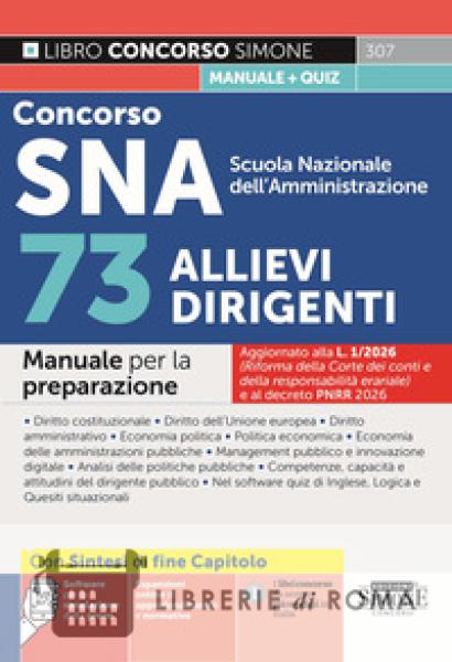 La preparazione al concorso per Allievi dirigenti SNA richiede non soltanto la conoscenza approfondita di determinate materie specialistiche, ma anche una visione d'insieme delle stesse. Il manuale Concorso SNA-Scuola Nazionale dell'Amministrazione 73 Allievi dirigenti, per il 12° corso-concorso selettivo, è concepito proprio per guidare il candidato attraverso un percorso di studio integrato. Grazie, infatti, a una sintesi organica delle diverse discipline, il testo consente di collegare le varie tematiche in modo coerente, offrendo, quindi, una solida base per affrontare le prove d'esame. Novità di questa edizione sono le sintesi di fine capitolo: uno strumento efficace per fissare i concetti fondamentali dell'argomento e velocizzare il ripasso. Il libro, aggiornato ai più recenti provvedimenti normativi, tra cui il decreto PNRR 2026 e la L. 1/2026, tratta le nozioni essenziali delle materie giuridiche ed economiche generalmente oggetto delle prove d'esame ed è così strutturato: Parte I - Diritto costituzionale; Parte II - Diritto dell'Unione europea; Parte III - Diritto amministrativo; Parte IV - Economia politica; Parte V - Politica economica; Parte VI - Economia delle amministrazioni pubbliche; Parte VII - Management pubblico, innovazione digitale e competenze dei dirigenti nella P.A.; Parte VIII - Analisi delle politiche pubbliche. Nel software online, oltre ai quiz a riposta multipla sulle materie specialistiche, vi sono quesiti di Inglese, Logica e Situazionali. Il manuale, infine, si arricchisce con espansioni online di approfondimento e normative.
