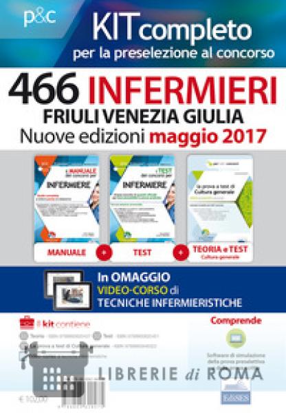 Uno strumento per la preparazione alla prova preselettiva e successive prove d'esame del Concorso per 466 Infermieri nel Friuli Venezia Giulia bandito con decreto dirigenziale del 24 maggio 2017, n. 47 e in attesa di pubblicazione in Gazzetta Ufficiale serie concorsi. I volumi contenuti nel kit sono aggiornati a maggio 2017 e alla legge 8 marzo 2017 n. 24 sulla responsabilità sanitaria. Il kit è composto da tre volumi: i test dei Concorsi per Infermiere, contenente un'ampia raccolta di quesiti ufficiali per test preselettivi e prove pratiche; il Manuale dei concorsi per Infermiere: manuale completo per la preparazione a prove preselettive e prove pratiche; la prova a test di cultura generale, contenente parte teorica ed esercizi commentati per la prova preselettiva. In omaggio con l'acquisto del pacchetto: il Video-corso di tecniche infermieristiche per la prova pratica (Gestione del rischio, Movimenti ed esercizi, Igiene e cura del paziente, Gestione dell'immobilità, Trattamento della cute e delle ferite); l'Ebook Legislazione sanitaria nazionale e regionale; un Software di simulazione per infinite esercitazioni.