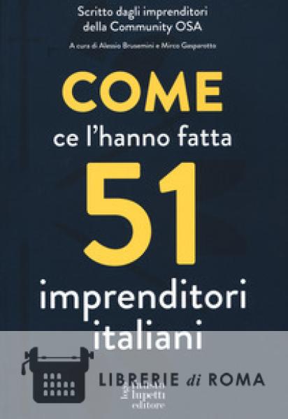 "Come ce l'hanno fatta 51 imprenditori italiani" è un volume che raccoglie le storie degli imprenditori membri della community OSA e i segreti del loro successo con lo scopo di divulgare una cultura d'impresa pratica, condivisibile ed efficace. Attraverso racconti di vita emozionanti arricchiti da esempi ed esperienze concrete, il libro affronta tematiche quali la strategia d'impresa, lo sviluppo della leadership, il marketing, l'innovazione, la crescita personale dell'imprenditore e l'intelligenza finanziaria. Campi nei quali ognuno degli autori è considerato un'eccellenza. E imparare dai migliori è sempre la tecnica giusta per trovare la strada verso il successo. Oggi la formazione e le competenze interne sono l'asset più importante che un imprenditore possiede per competere sul mercato, ma non è facile capire se e dove investire il proprio tempo e le proprie risorse per ottenere conoscenze e informazioni di valore e pratiche, da applicare efficacemente al proprio business. Per questo il Master Business Coach Alessio Brusemini e il mentore degli imprenditori d'eccellenza Mirco Gasparotto hanno creato OSA, la community riservata solamente ad imprenditori desiderosi di imparare e condividere formazione e informazioni. OSA è per i suoi membri una grande occasione di ricevere le risposte e le soluzioni concrete, che cercavano invano da tempo nel mondo della formazione o tra le proprie amicizie. A ogni serata si affrontano argomenti unici, arrivando rapidamente al nocciolo dei problemi ed entrando in contatto con l'Italia che produce.