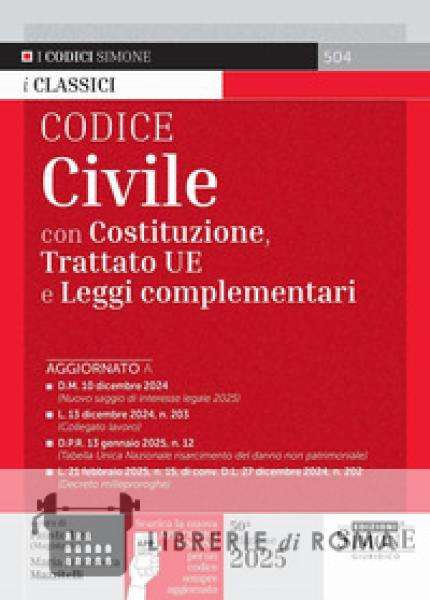 I Codici classici Simone, di cui il Codice Civile 2025 e Leggi complementari riporta la Costituzione, il Trattato UE e una selezione delle norme civilistiche principali e di più frequente consultazione, aggiornati alle più recenti novità normative. Per comodità di consultazione, le Leggi complementari sono suddivise per argomento: Adozione; Assicurazione (RCA e Contratti); Banca; Brevetti e Marchi; Cittadinanza; Concorrenza; Consumatori; Crisi d'impresa; Danno alla persona; Intermediazione finanziaria; Lavoro; Locazioni; Matrimonio; Persone giuridiche; Separazione e Divorzio; Società; Stato civile; Testamento biologico; Titoli di credito; Unione europea; Unioni civili e Convivenze. Punto di forza dell'opera è, oltre alla facilità di consultazione, l'articolato indice analitico-alfabetico, arricchito di voci, richiami e rimandi, per un immediato reperimento delle norme e l'inquadramento degli istituti civilistici. I Codici classici per i contenuti proposti rappresentano quindi un valido e aggiornato strumento di studio e/o lavoro per magistrati, avvocati, studenti universitari e partecipanti ai pubblici concorsi. Il Codice Civile 2025 con leggi complementari è disponibile anche sulla nuova App Codici Simone che permette di consultare il codice dal tuo smartphone e averlo sempre aggiornato in tempo reale. L'App, disponibile per Android e iOS, è scaricabile gratuitamente attraverso il QR Code posto nell'ultima pagina del libro. I codici rappresentano alcuni dei prodotti più storici di Edizioni Simone che produce e aggiorna costantemente da oltre 50 anni: i migliori codici civili esplicati e i migliori codici penali esplicati, sono quelli più completi e al contempo facili da consultare ed è in quest'ottica che ci occupiamo da decenni di aggiornare e migliorare i testi sfruttando i codici sul mercato più collaudati in assoluto per la preparazione di esami universitari e concorsi pubblici.