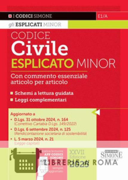 Il "Codice Civile Esplicato Minor" rientra nella collana dei Codici Esplicati Minor e costituisce uno strumento di studio fondamentale per quanti hanno la necessità di comprendere il testo codicistico. Sotto ogni articolo è riportato, infatti, un commento essenziale che mette in evidenza il contenuto della norma e il caso concreto disciplinato. Tale commento è stato reso più leggibile attraverso l'uso del colore e di caratteri più chiari. Per facilitare lo studio e la lettura del codice sono riportati numerosi schemi a lettura guidata, a fronte dei quali sono presentate le definizioni degli istituti codicistici rappresentati. Gli schemi sono altresì richiamati con un opportuno rinvio in calce a ogni articolo di riferimento. Tale apparato di esplicazioni e di schemi rappresenta non solo un complemento alla consultazione delle norme, ma anche un sussidio per chi deve studiare materie privatistiche (diritto privato, diritto civile, diritto del lavoro, diritto commerciale), presentandosi come un utile supporto ai manuali istituzionali. Completa il lavoro una breve sezione relativa alle leggi complementari (Adozione, Consumatore, Matrimonio e Divorzio, Unioni civili e Convivenze), che fornisce una panoramica aggiornata della normativa speciale essenziale. Tutte le norme sono aggiornate alle più recenti novità normative e giurisprudenziali. Tra i provvedimenti di modifica si segnalano la L. 5-3-2024, n. 21 (Legge capitali); il D.Lgs. 6-9-2024, n. 125 (Rendiconta-zione societaria di sostenibilità); il D.Lgs. 31-10-2024, n. 164 (Correttivo Riforma Cartabia del processo civile). Tra le novità giurisprudenziali si segnala Corte cost. 148/2024 sulla tutela del convivente nell'impresa familiare. Un ampio indice analitico-alfabetico chiude il Codice, facilitando la ricerca del dato normativo.