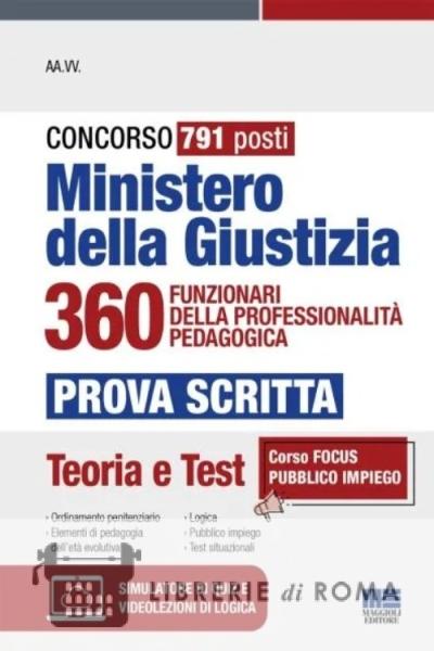 Il manuale è un utile strumento di preparazione al Concorso indetto dal Ministero della Giustizia per 791 posti, per il profilo dei 360 funzionari di professionalità pedagogica. Il bando prevede di selezionare i candidati attraverso le seguenti prove: prova scritta: test da risolvere in 60 minuti composto da 40 domande di cui 25 sulle materie specifiche al profilo, 8 quiz di logica e 7 test situazionali; prova orale: colloquio sulle materie della prova scritta e ulteriori materie. Il manuale illustra in maniera chiara e approfondita le materie richieste per la prova scritta: Ordinamento penitenziario con particolare riferimento al D.P.R. 448/1988, D.Lgs. 272/1989, D.Lgs. 121/2018; Elementi di pedagogia dell'età evolutiva con particolare riferimento ai fenomeni della devianza e della marginalità; Norme generali in materia di pubblico impiego, con particolare riferimento alle responsabilità, doveri e diritti dei pubblici dipendenti, codice di comportamento e sanzioni disciplinari; Quiz di logica a cura di Giuseppe Cotruvo con videolezioni e tecniche di risoluzione; Quesiti situazionali.