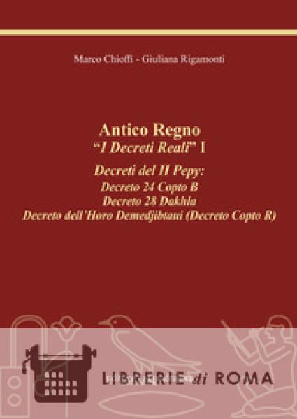 Con "I Decreti Reali" vol. I, Marco Chioffi e Giuliana Rigamonti presentano la nuova, annuale pubblicazione relativa a tre Decreti Reali di cui due risalenti all'Antico Regno e il terzo all'VIII dinastia. Il decreto Copto B, emesso dal II Pepy, e il Decreto Copto R, dell'Horo Demedjibtaui, sovrano dell'VIII dinastia, furono rinvenuti da Reinach e Weill negli anni 1910-1911 nel sito in cui sorgeva il tempio del III Thutmosi, nell'area centrale del vasto complesso templare di Copto. I due testi sono incisi su stele di calcare che, con altre cinque lastre riportanti anch'esse decreti reali, erano state interrate a livello dei blocchi di fondazione del tempio per preservarle da eventuali distruzioni successive, essendo considerate oggetti sacri. È probabile che le stele fossero esposte, affiancate e incastrate, nel muro di un medesimo edificio: la porta di Min di Copto, come è citato nel Copto B e in altri due Decreti, Copto C e Copto D. Il Decreto reale, stilato nella grande Sala dell'Horo e sigillato alla presenza del re, è l'ordine del sovrano che parla in nome di Horo ed è quindi legge.